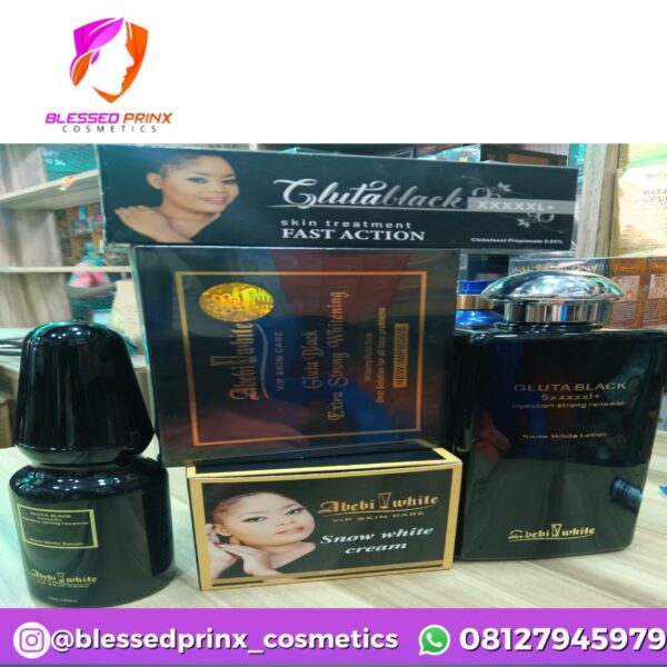 Abebi White Gluta Black 5xxxxxl+ facial and body set is the new version of Glutathione Injection Strong Whitening Milk.