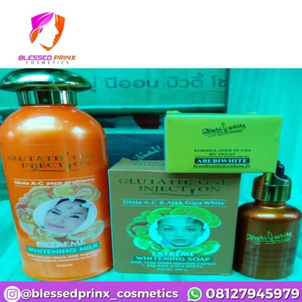 Abebi white Glutathione Injection extreme whitening milk body set Clears, whitens and nurture the skin into healthier balance and radiant glow. Infused with Milk Protein and L-Glutathione to help whiten, nourish and rejuvenate; with Vitamin C, a powerful antioxidant, protect and effectively improves overall skin tone, while collagen stimulating synthesis and promoting cell renewal. This luxurious body lotion will leave your skin perfectly bright, white and smooth