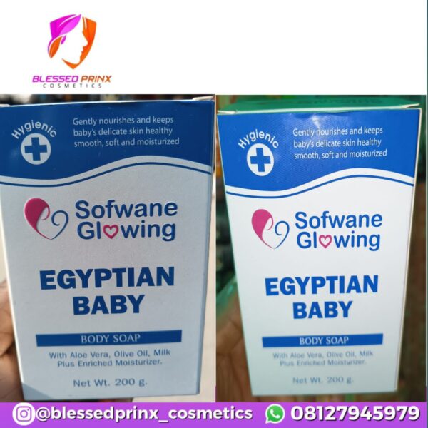 ABEBI WHITE VIP SKINCARE SOFWANE GLOWING EGYPTIAN BABY SOAP WITH ALOE VERA, OLIVE OIL, MILK PLUS ENRICHED MOISTURIZER: This moisturizing Baby Soap with aloe Vera, Olive oil, & Milk Extract helps to clean and keep the moisture balance of the skin to make baby’s skin soft and supple With a pH 5.5.