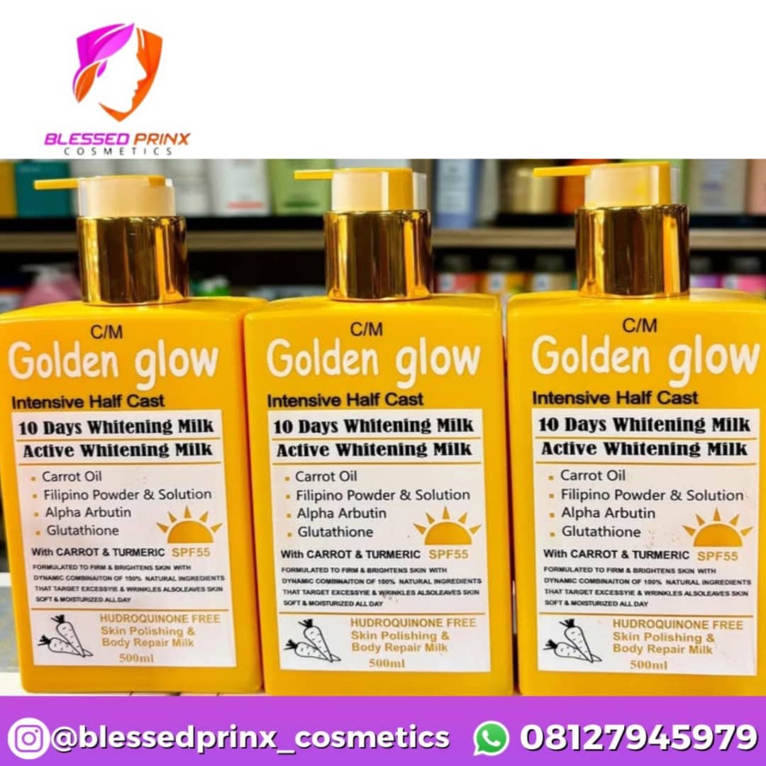 Golden glow is an intensive half cast skin whitening, polishing and repair milk with active ingredients like philipino powder and solution, glutathione,carrot oil and tumeric. with spf 55 to protect your skin against unfavourable climate. The best quality whitening lotion that helps in facial treatments.