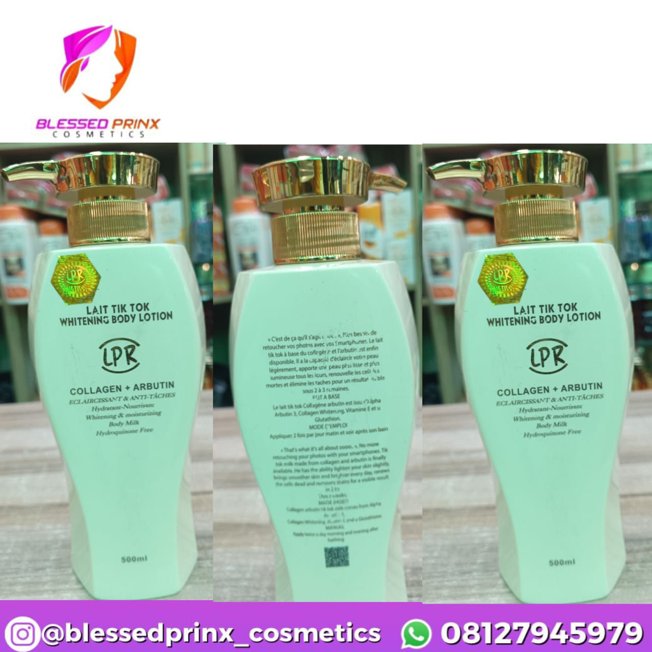 Lait Tik Tok Glutathione + Collagen whitening Body lotion is highly made well refined natural plants such as Glutathione, Collagen, and Milk Extract to help in Brightening and hydrating. It nourishes the skin even out while removing black spots on your skin. Otherwise the old cells will be renewed and your skin become clearer and cleaner again.