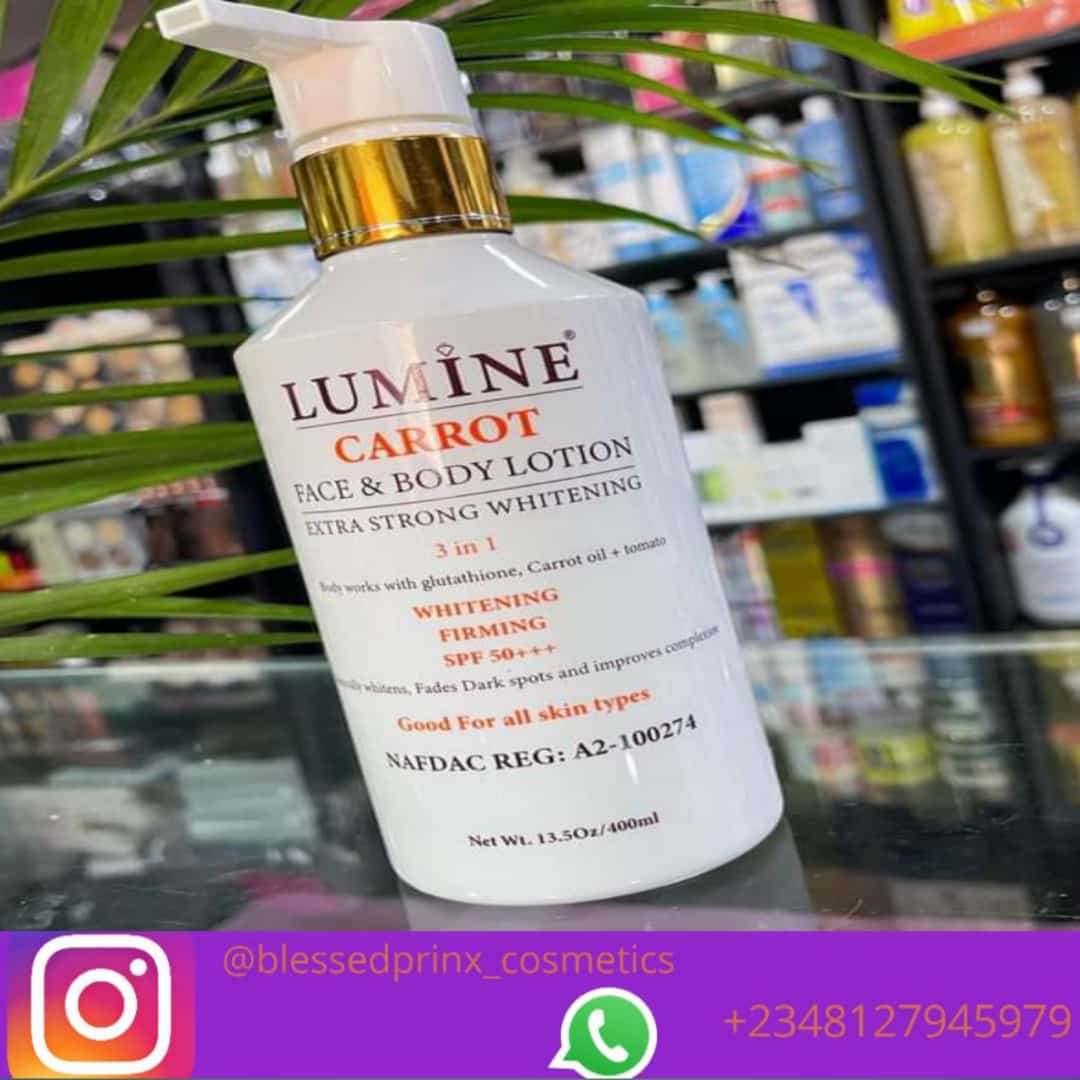 LUMINE CARROT FACE AND BODY LOTION IS AN EXTRA STRONG WHITENING LOTION IS FORMULATED WITH CARROT OIL, GLUTATHIONE, TOMATOE TO EFFECTIVELY WHITEN, BRIGHTENING AND FADE AWAY DARK SPOTS, SUNBURN, PIMPLES MARKS AND FRECKLES WHILE THE SUNSCREEN HELPS TO PROTECT THE WHITEN SKIN FROM THE DAMAGE OF THE SUN RAYS.