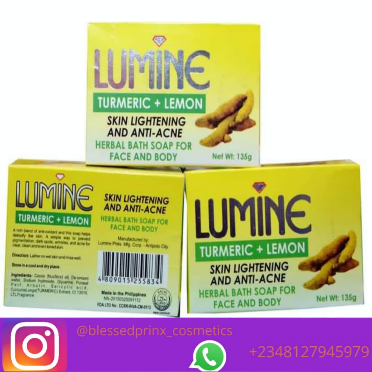LUMINE TUMERIC + LEMON SKIN LIGHTENING & ANTI ACNE 🌿 HERBAL TABLET SOAP IS A BLEND OF ANTI-OXIDATE TO DETOX AND PREVENT PIGMENTATION MARKS, ACNE BLEMISHES, AND PIMPLES MARKS FOR A CLEAR, CLEAN AND SMOOTH SKIN.