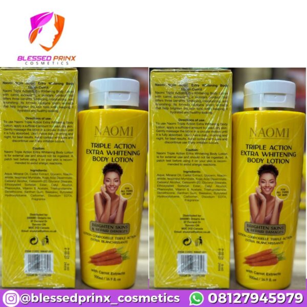 NAOMI TRIPLE ACTION EXTRA WHITENING LOTION WITH CARROT EXTRACT: Naomi triple action Extra whitening body with carrot extract is a skincare product that offers three benefits; whitening, moisturizing and nourishing. It’s formula contains carrot extract to help brighten the skin tone while keeping it hydrated and healthy looking.