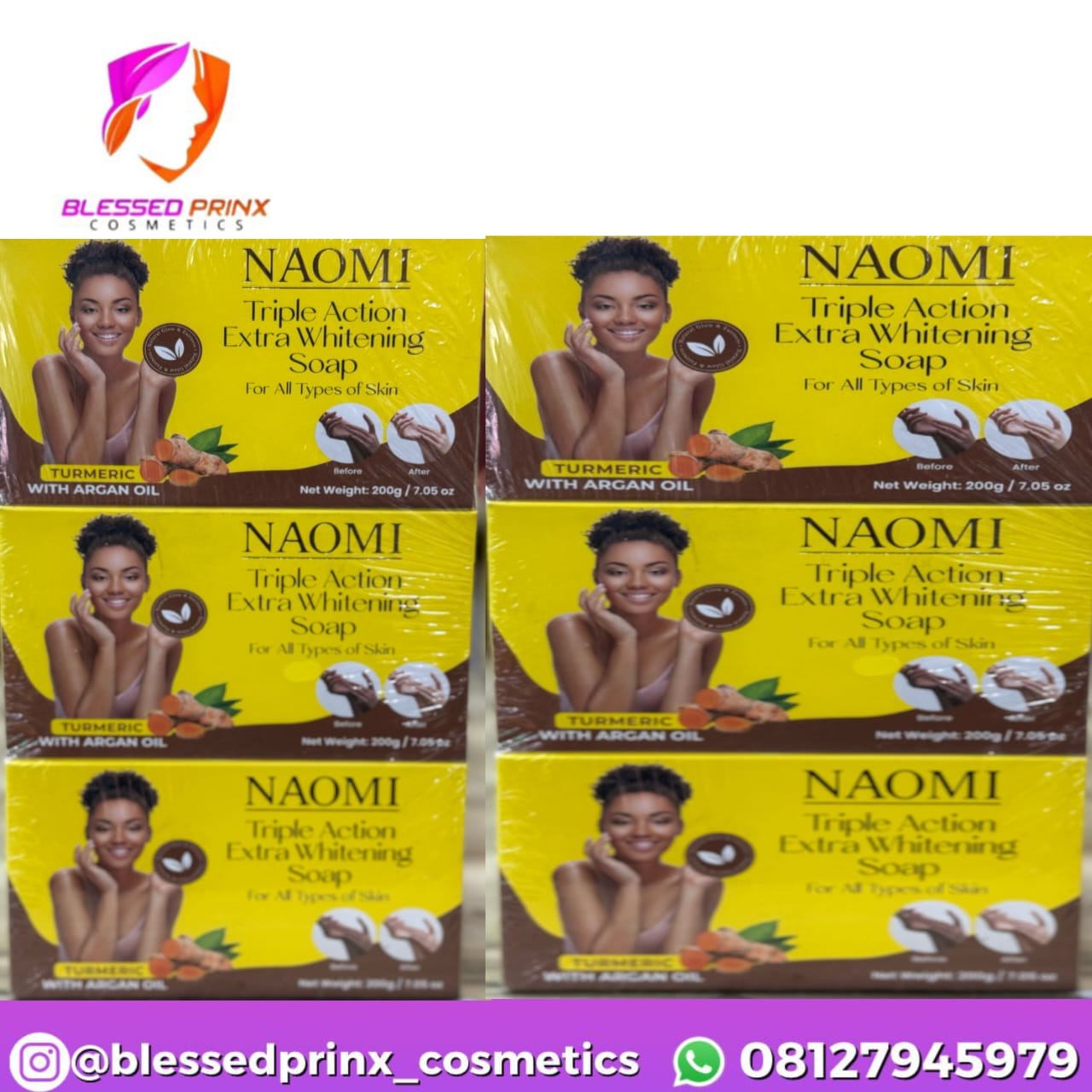 NAOMI TRIPLE ACTION EXTRA WHITENING SOAP TURMERIC WITH ARGAN OIL EXTRACT: is a soap that contains natural TURMERIC extract known for their skin brightening properties. It aims to provide triple action benefits of deep cleansing, Extra whitening and Nourishing the skin, leaving it glowing, smooth and youthful looking.