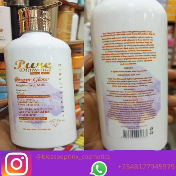 Pure diamond super whitening lotion enriched with kojic acid and glutathione Rose hip oil with whitening milk effectively fade away dark spot and also with anti stretch mark oil that heals stretch marks.