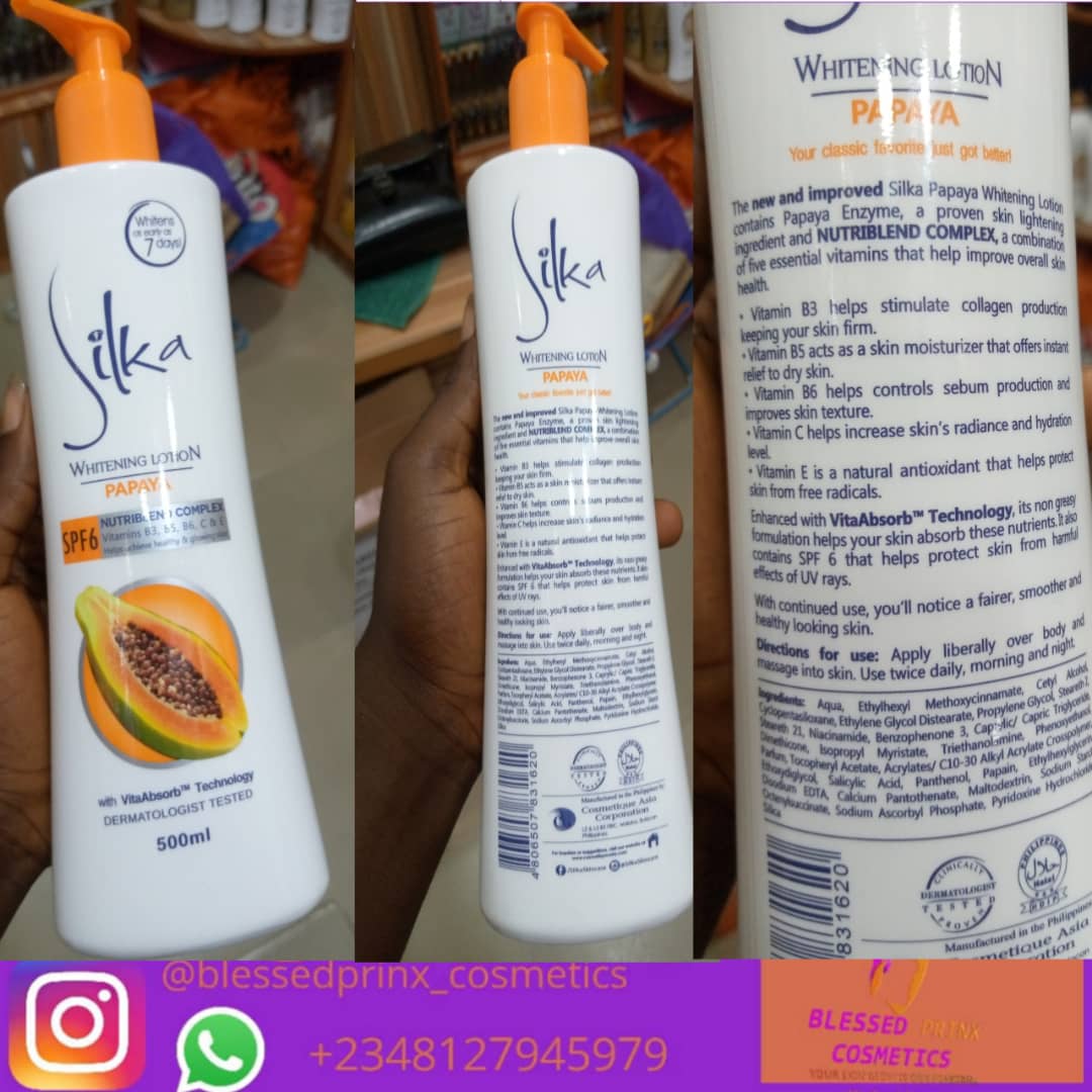 SILKA PAPAYA WHITENING LOTION CONTAINS PAPAYA ENZYME, A PROVEN SKIN LIGHTENING INGREDIENT AND NUTRIBLEND COMPLEX, WITH A COMBINATION OF FIVE ESSENTIAL VITAMINS THAT HELP TO IMPROVE OVERALL SKIN HEALTH.