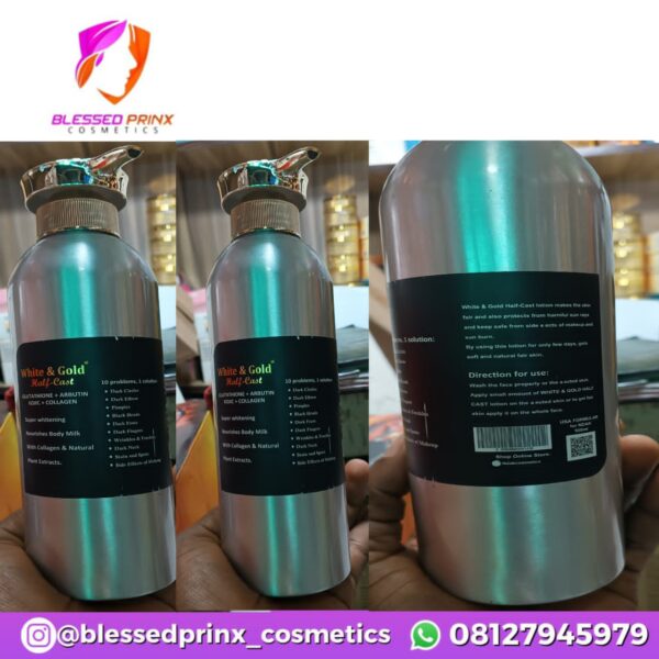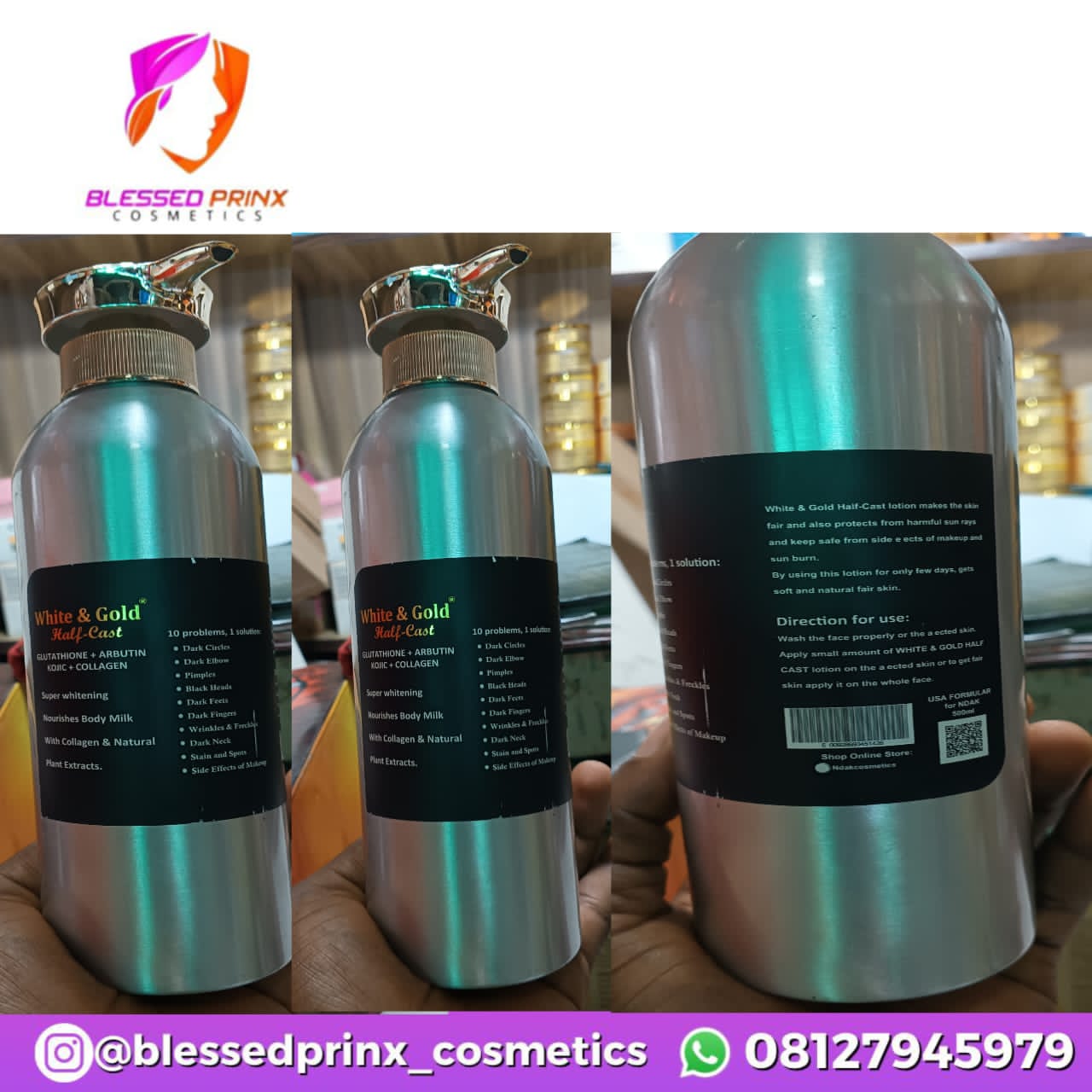 WHITE & GOLD HALFCAST BODY MILK LOTION WITH GLUTATHIONE, ARBUTIN, KOJIC & COLLAGEN: Is a super whitening body Milk with natural plants extract to make the skin fair, Nourish the skin, Protects the skin from harmful sun rays, keep skin safe from side effects of makeup and sunburn.
